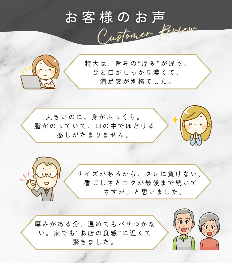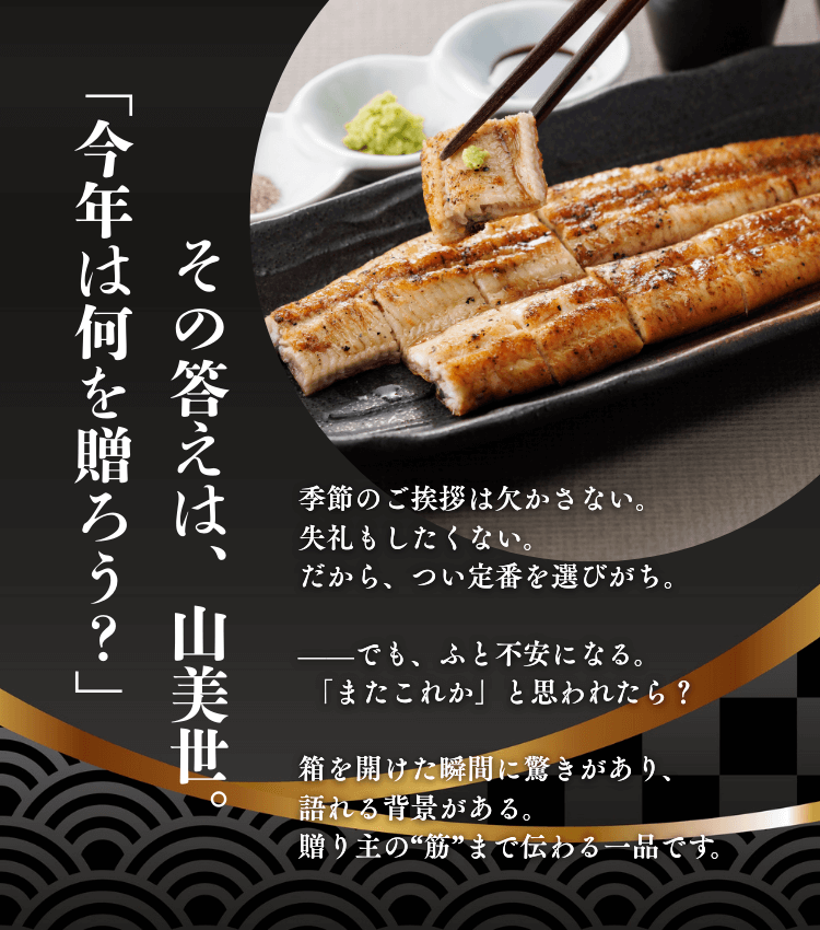 贈答で注文する 大切な人を驚かせるギフト お探しですか? 自宅用で注文する 山美世のうなぎ 届くのは、老舗の仕事。 うなぎ蒲焼・白焼 【特大サイズ】うなぎ蒲焼 約290g “別格サイズ”の贅沢一本 ¥6,700 (税込) うなぎ蒲焼・白焼 【特大サイズ】うなぎ素焼き 約290g 極上素焼・藻塩付き ¥6,700 (税込) うなぎ蒲焼・白焼 【ギフト】八雲 三味御膳セット|蒲焼・素焼・う巻き詰め合わせ ¥12,400 (税込) うなぎ蒲焼・白焼 【ギフト】山美世の二味うなぎ〈蒲焼・素焼 各一尾〉 ¥10,300 (税込) うなぎ蒲焼・白焼 【ギフト】山美世の味舞ギフト〈蒲焼・う巻き〉 ¥7,100 (税込) うなぎ蒲焼・白焼 【ギフト】山美世の極味セット | 蒲焼・素焼・珍味の贅沢詰合せ ¥9,500 (税込) うなぎ蒲焼・白焼 【ギフト】山美世の祝いうなぎ〈紅白と佃煮の詰合せ〉 ¥6,300 (税込) うなぎ蒲焼・白焼 【ギフト】山美世の紅白膳〈炊き込みご飯セット〉 ¥6,900 (税込) ギフト・贈答用 【ギフト】山美世の贈りうなぎ 炊き込みご飯セット ¥4,200 (税込) うなぎ蒲焼・白焼 【ギフト】山美世の贈りうなぎ〈蒲焼と煮付けの詰合せ〉 ¥3,500 (税込) うなぎ蒲焼・白焼 【国産】うなぎ蒲焼 約215g 老舗が焼く“肉厚大サイズ” ¥5,200 (税込) うなぎ蒲焼・白焼 【大サイズ】うなぎ素焼き 約215g (真空パック)藻塩付き ¥5,200 (税込)